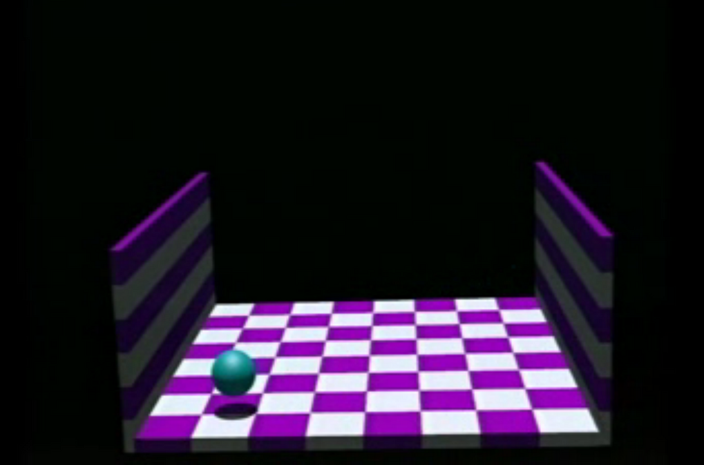 This video shows how our our perception of object movements is manipulated by two types of prior knowledge: the fact that light sources usually are stationary and that there are only certain kinds of cast shadows objects normally create. The first part of the video shows a blue ball floating from the upper right corner to the lower left corner (and back). The following part apparently shows the ball rolling back and forth. Importantly, the ball moved in exactly the same way on the screen in these two parts; the only thing that changed was how the shadow moved on the ground. Accordingly, by removing the shadow, as shown in the next sequence, the movement of the ball becomes ambiguous: it could either be floating or rolling. Zigzagging shadow motion in the two following parts induces apparent zigzagging motion of an object. We do not see the correct linear trajectory of the blue ball although changes in shadowing on the ball and on the checker board indicate that the light source is moving (in the last sequence of the video). The yellow line allows us to verify that the path of the ball is indeed linear.
